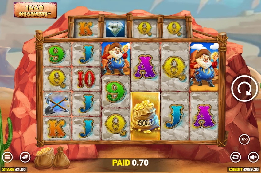 The icons are straight out of the Wild West playbook, with a big sparkling diamond (land 6 on a pay-line and earn a 50x your bet treat), a gnarly white bearded miner, a mining lamp and a pair of crossed pickaxes. The lower value icons are the Ace through 9 of the card deck in a colourful old fashioned font.